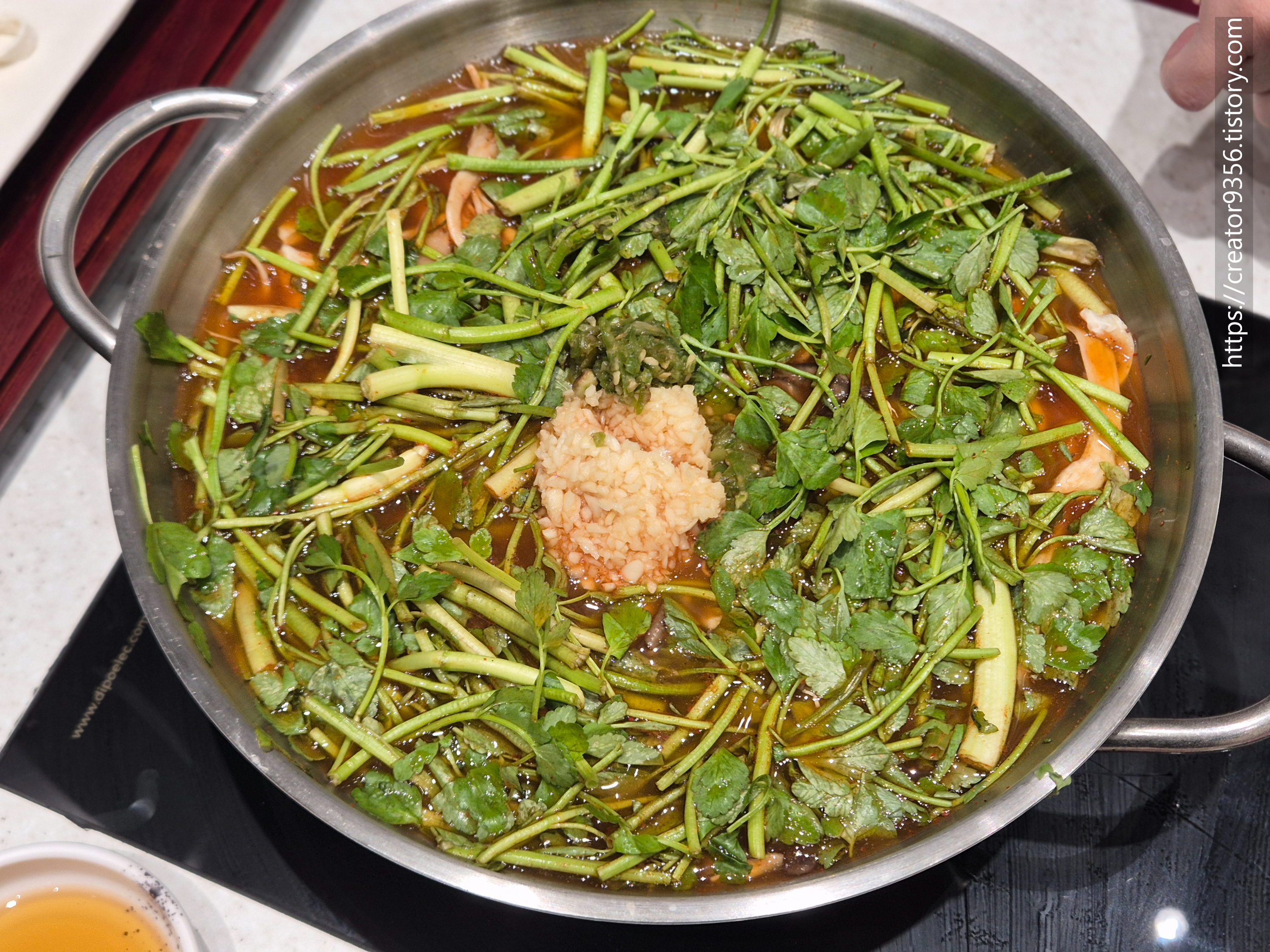 끓는 육수에 차돌박이와 미나리를 살짝 데쳐서 먹었는데 고기의 고소함과 미나리 향이 잘 어울려서