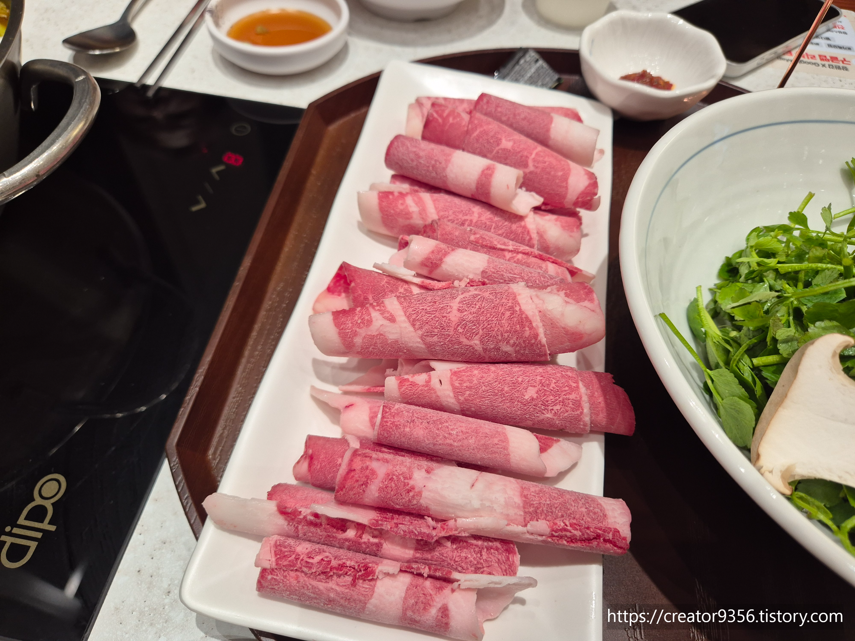 일반적인 샤브샤브 집에서 나오는 얇은 냉동 고기 느낌이 아니라 색깔도 선명하고 고기 상태가 꽤 괜찮아 보였어요.