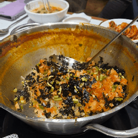 샤브샤브 국물에 밥과 김치를 넣어 볶아 먹는 방식인데 들기름 향이 은은하게 올라와서 식사 마무리로 부담 없이 먹기 좋았어요.이렇게 코스로 이어지는 식사라 생각보다 든든하게 먹을 수 있었어요.